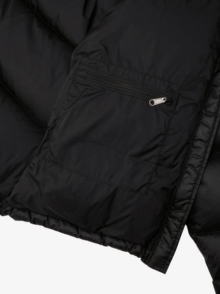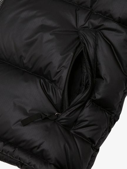 環境に配慮したリサイクルダウンを中わたの一部に使用。表地は強度がある40デニールのリップストップナイロンにはっ水加工を施し、パックに干渉する肩部分はナイロン素材で補強しています。