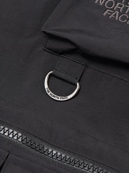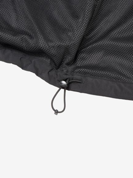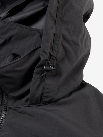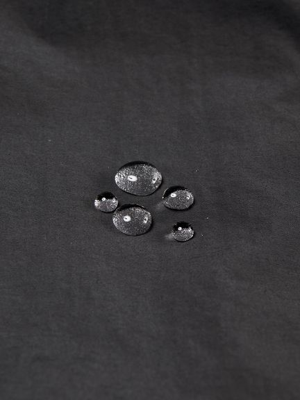 表地はコットンライクな表情のタスランナイロンを使用。フッ素化合物を含まないはっ水剤を使用したはっ水加工を施しており、多少の雨や汚れに対応します。裏地は肌離れのよいポリエステルメッシュ。大容量のマチ付きポケットは、中身が落ちにくいように面ファスナー式のフラップ付き。右胸のハーフドーム型ファスナーポケットは、貴重品の収納に便利です。背面にも大容量のマチ付きポケットを配置。襟にフードを収納できるビルトインフード仕様です。